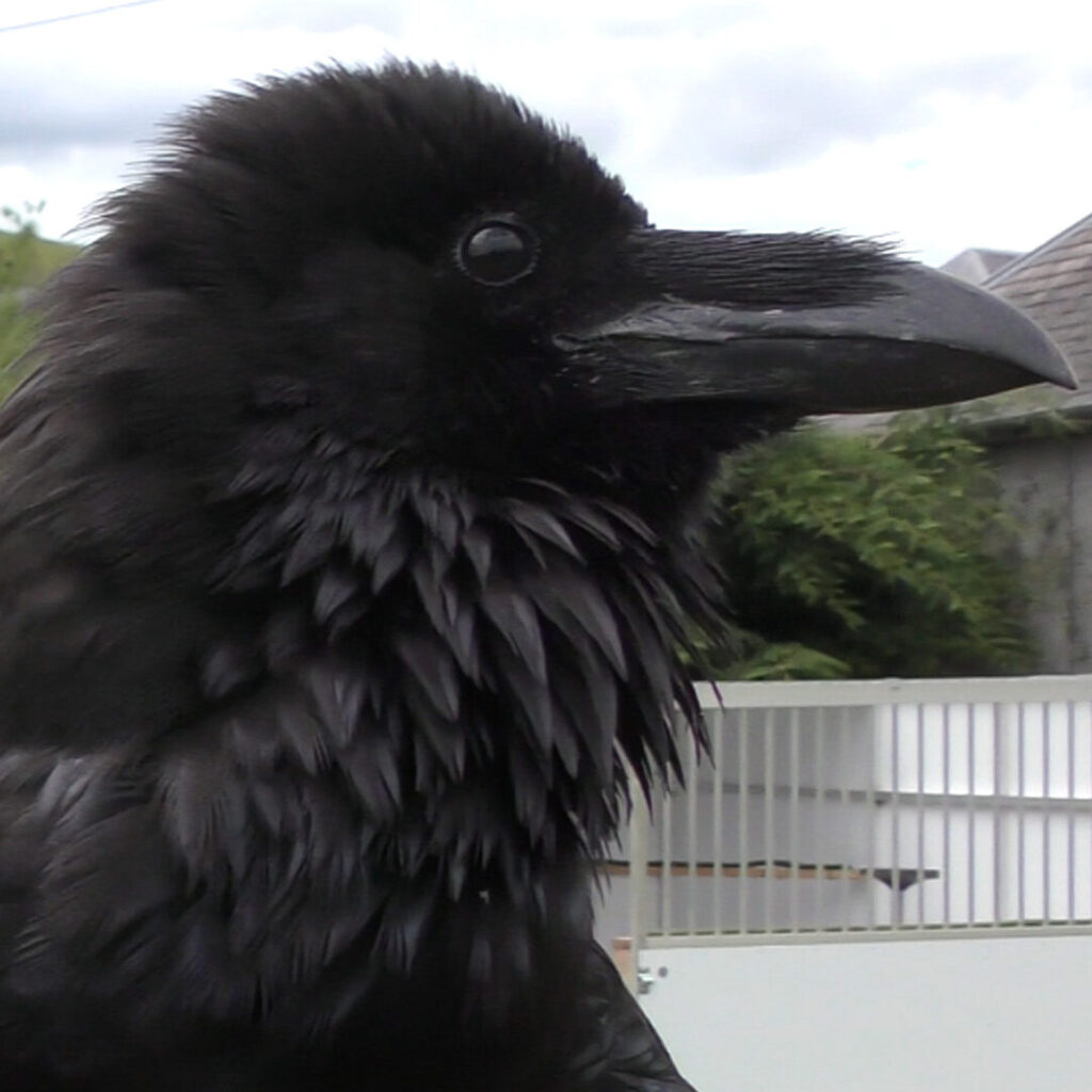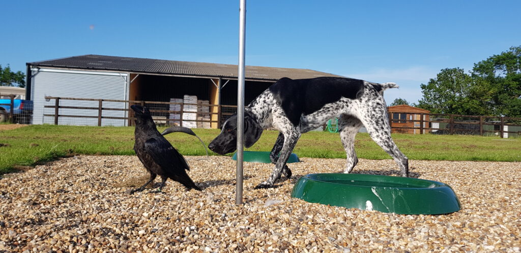 She is not overly fussed about wild crows, jackdaws or rooks in her territory, but mostly dislikes the wild ravens that come by for a look or to fly over. They have their own established territories, and just because they are of the same species, it does not mean they always wish to interact. Fable will assume they may pose a threat to her. She typically comes to me or heads back to her aviary, which are her safe spaces. She also detests buzzards and red kites in her air space, and becomes very vocal about them.